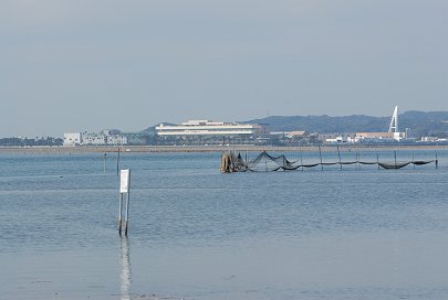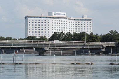 浜名湖は海につながる海水域から汽水域が広く、さまざまな釣りが楽しめます 浜名湖はさまざまなマリンレジャーが楽しめますが、漁師さんたちがおいしい海産物をとる湖でもあります。 大切な網や養殖棚がたくさんありますから、気をつけて進みます。 遠くに浜名湖競艇場の建物が見えてきます。 |