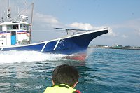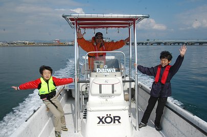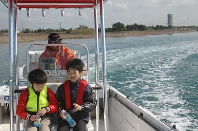 「海に出ようよ」 冒険好きなカナルボーイたちが今切口の波を見て叫びます。 カナルでは乗船の際には必ずライフジャケットの着用を義務づけています。これを着けると誰でも海の男になってしまいますね。 突堤には海釣りをするみなさんが竿を振るう絶好のポイントとしても知られています。 |