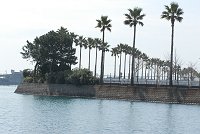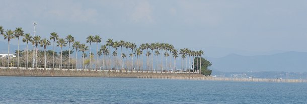 競艇場の東側見事なパームツリーが続いています。年中暖かな浜名湖に似合っていますね。 |