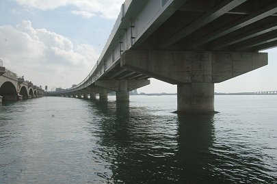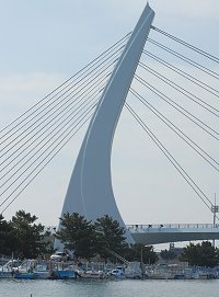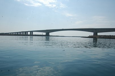 | 舘山寺内湾を出れば右前に東名高速道路浜名湖橋が見えてきます。 橋の西側には浜名湖サービスエリアがあります。 |