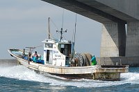 浜名湖が海につながる今切口(いまぎれぐち)の上には国道1号の絶景ポイント、浜名大橋がかかっています。 多くの車が走り抜ける際に浜名湖側を見る、その湖を航行しています。 多くのシラス漁の船が出入りしています。 |