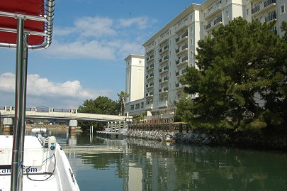 もう一度南へ戻り、水路を北へ進み、EXVを右に見て水路を航行します。 カナルは開業5年、翌年から建設が始まったEXVとともに新しい浜名湖のリゾート地域を作り上げています。 |