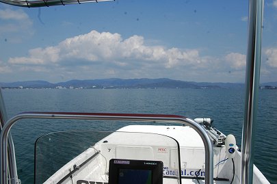 水路を抜けて再び広い湖に出てきました。 ここから右に進路をとれば、浜名湖の奥座敷、舘山寺へ向かうことができます。 ここでカナルスペシャル艇の速度テストを行いました。(余裕で64kmを記録しました) 浜名湖は周囲110kmほどもある大きな湖です。 ポイント間の移動を安全に注意しながら、楽しんでいます。 |