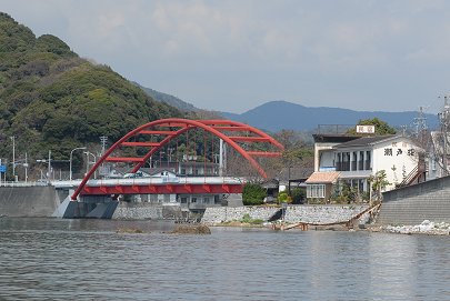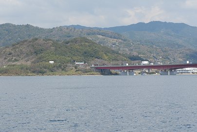 佐久米、都築の三ケ日青年の家などを回りこみますと、奥浜名湖である猪鼻湖の入り口には、赤い欄干の新瀬戸橋が見えてきます。 手前に見えるのは浜名湖唯一の島、礫(つぶて)島、瀬戸には瀬戸ハマナ・コスタ港遊覧船乗り場があります。 |