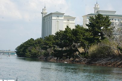 こちらが猪鼻湖のシンボル、猪鼻湖神社、この辺りは釣り場でもあり、神社から釣り糸を垂らす人を見かけます。 神社を過ぎれば三ケ日地域、東急リゾートやホテル群など、奥浜名湖のリゾートへと続いています。 |