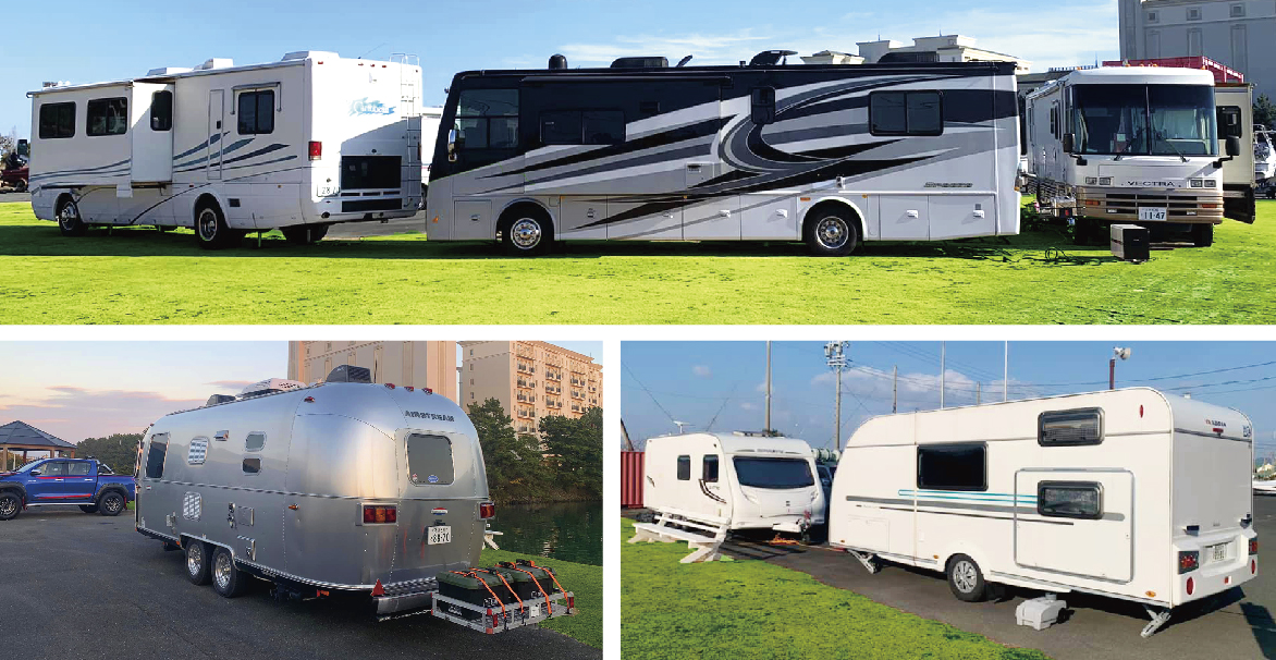 ●トレーラーや自走タイプ等、全てのキャンピングカーの保管がOK。自動車管理者保険にも加入、