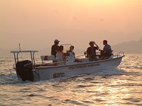 第14回 H16.4.27 浜名湖の夕焼け 全国的に雨の一日、晴天続きの中で休憩日になりました。 TV取材でも使用したカロライナスキッフ、カメラクルーを前に乗せ、3人が乗っても安定した船はスタッフに評判でした。幅広な床は機材を乗せても歩けるほどの広さ、釣行など道具類を満載してお使いいただけます。 |