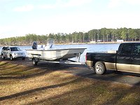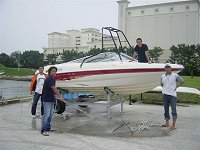 第41回 H16.6.1 毎週火曜日は定休日 ボートクラブカナルは定休日 海外レポート@1/28 カロライナスキッフ本社視察、(ジョージア州ウェイクロス近郊) スタッフと2180DLXの試乗です。 小さな湖をヤマハ100ps4stでガンガンテストしました。先週末は大西洋(20マイル)でフィッシングしたそうです。(スタッフ) |
