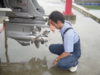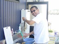 第47回 H16.6.10 釣りの後はみんなで洗艇 オーナーの青木さん今日は仲間とキス&タコ。 たくさんのキスを釣ってきました。 |