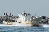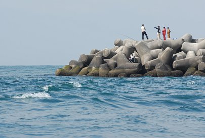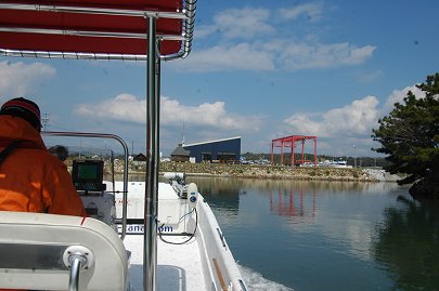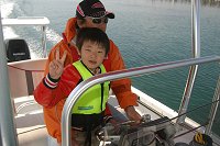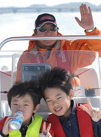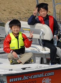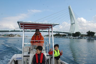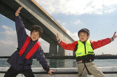 「海に出ようよ」 冒険好きなカナルボーイたちが今切口の波を見て叫びます。 カナルでは乗船の際には必ずライフジャケットの着用を義務づけています。これを着けると誰でも海の男になってしまいますね。 突堤には海釣りをするみなさんが竿を振るう絶好のポイントとしても知られています。 |