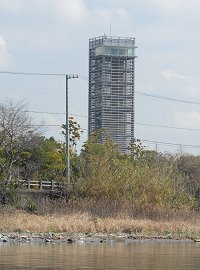 水路の両側はガーデンパーク、取材が平日の朝でしたのでお客さんが見えませんが、日中ここを走れば多くの方が船に手を振ってくれます。 水路を出れば、表浜名湖へ向かいます。遠浜名湖ガーデンパークのシンボルタワーが見えます。 |