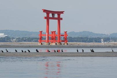 海開きの花火会場としてもおなじみ弁天島のシンボルは赤い大鳥居です。 遠浅の浜名湖はここでは大きな中州を作っています。 多くの鳥たちが遊ぶ中州の浅瀬まわりもカロライナ・スキッフの得意な場所、昨年のスキッフミーティングでは中州にビーチングして楽しみました。 |