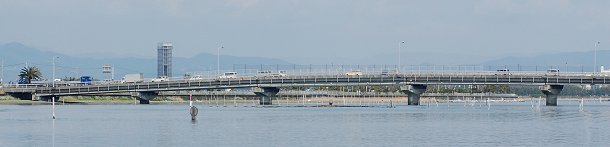 | 舘山寺内湾を出れば右前に東名高速道路浜名湖橋が見えてきます。 橋の西側には浜名湖サービスエリアがあります。 |