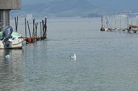 浜名湖は海につながる海水域から汽水域が広く、さまざまな釣りが楽しめます 浜名湖はさまざまなマリンレジャーが楽しめますが、漁師さんたちがおいしい海産物をとる湖でもあります。 大切な網や養殖棚がたくさんありますから、気をつけて進みます。 遠くに浜名湖競艇場の建物が見えてきます。 |