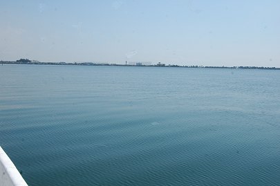猪鼻湖を折り返して再び浜名湖へ、遠く春霞の中に見えるのがEXVの白い建物、浜名湖はこのように海のように広く、船を楽しむ私たちの自由な遊びを誘ってくれます。 船を岸沿いに洲ノ鼻を越えて松見ケ浦へと進めていきます。 |